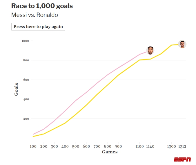 文中,ESPN还做了一个梅西与C罗进球数、场次数对比。C罗目前1313场967球,梅西1146场903球。