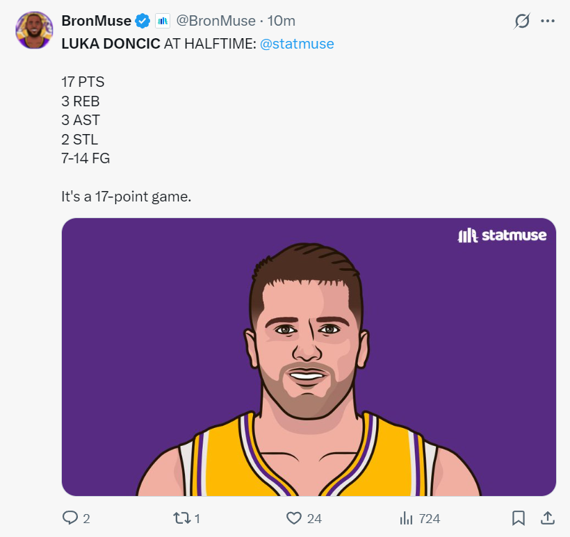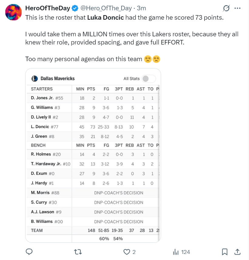 上半场打完东契奇拿到17分3篮板3助攻2抢断,詹黑媒体写道:快船这个阵容就是之前东契奇砍下73分的配置,但比起现在湖人的阵容我宁愿选择快船,因为他们至少清楚自己的角色能拉开空间并全力以赴,而现在的湖人队个人私心杂念太多。